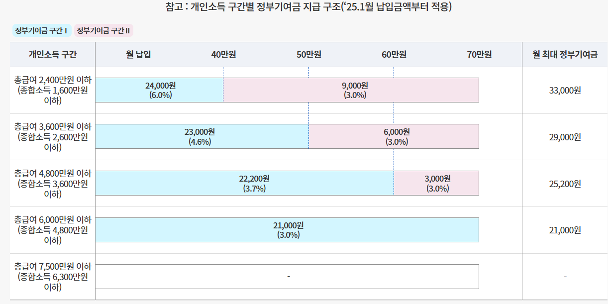 • 납입액이 클수록, 소득이 낮을수록 정부기여금은 커집니다.