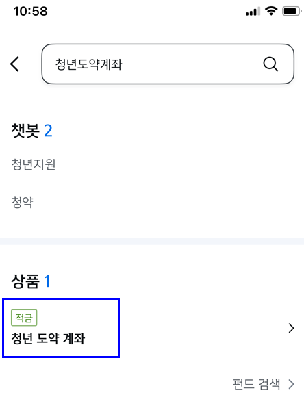 1. 청년도약계좌 가입신청했던 은행 어플 들어가서 검색어에 [청년도약계좌] 입력 후 조회
