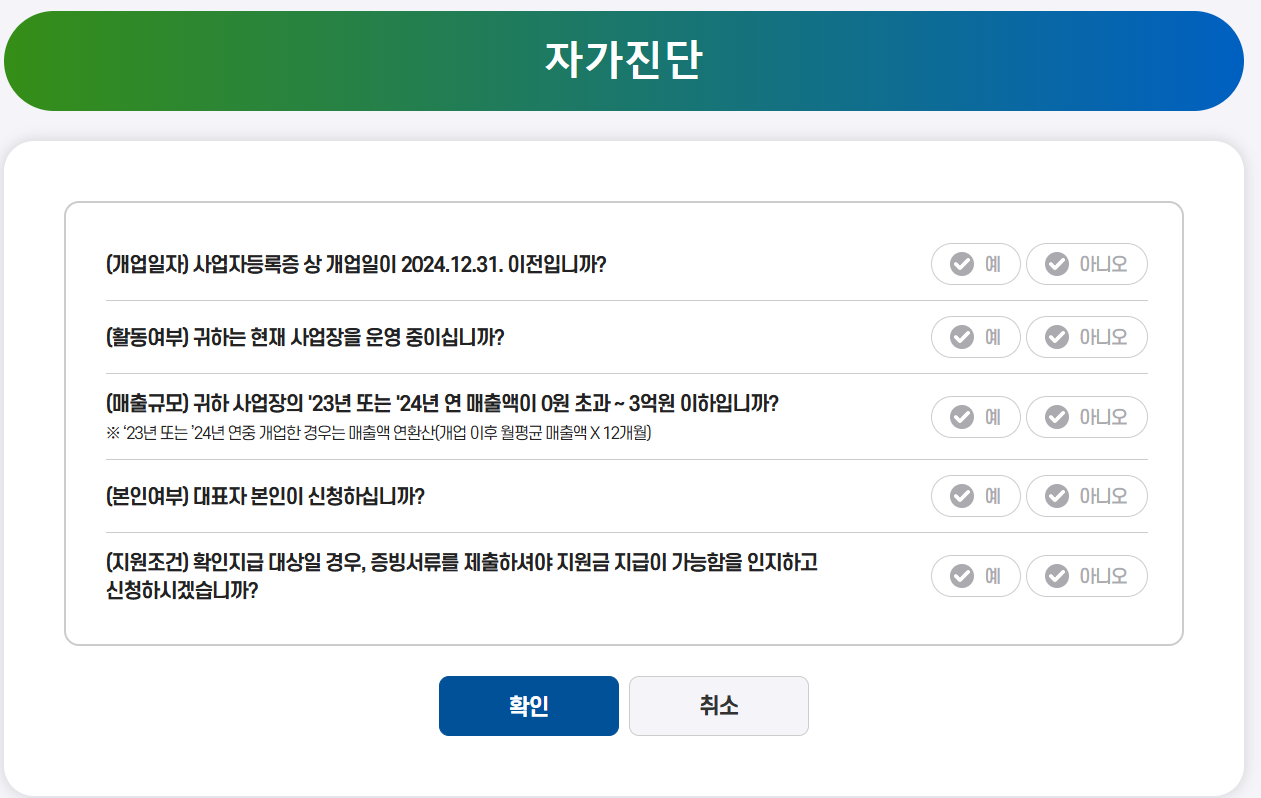 - [신청하기] 클릭 후 자가진단 → 사업자등록번호 입력 → 본인인증 → 정보동의 후 사업자 정보 입력